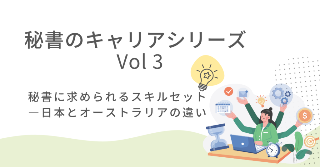 秘書に求められるスキルセット ― 日本とオーストラリアの違い 「秘書」と聞くと、日本とオーストラリアでは求められるスキルがかなり違うと思っています。今回はシリー... -